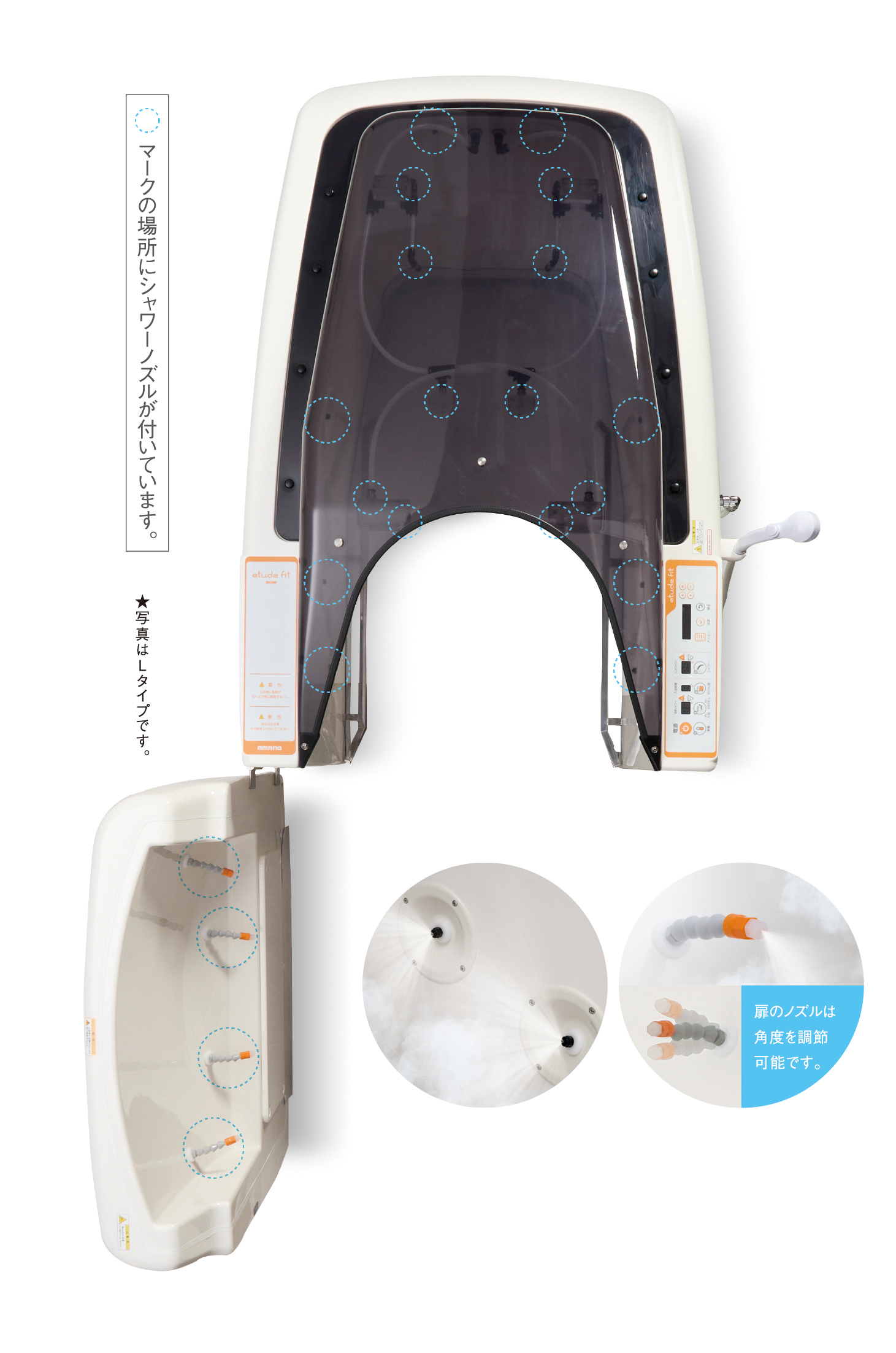 あたたかさの秘密は、肩口から足元まで22ヵ所のシャワーノズル