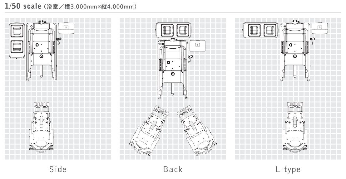 ※ 貯湯タンクは浴槽の横や後ろまたL字型にも設置可能です。